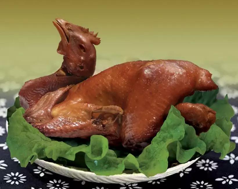 福宁烧鸡,只挑选农场散养公鸡(寓意“小凤凰”),供礼成品色泽鲜亮,头脚齐整,形态上昂首展翅,寓意先祖在天之灵保佑后辈能够飞黄腾达,大吉大利。